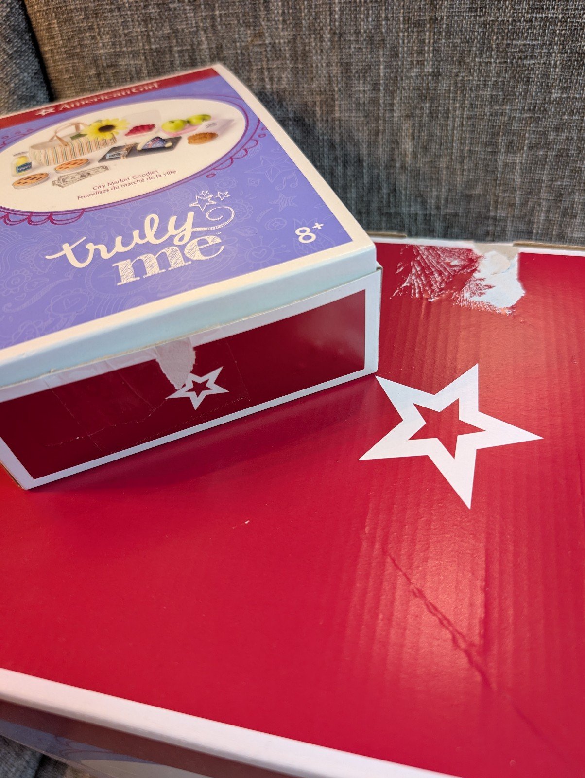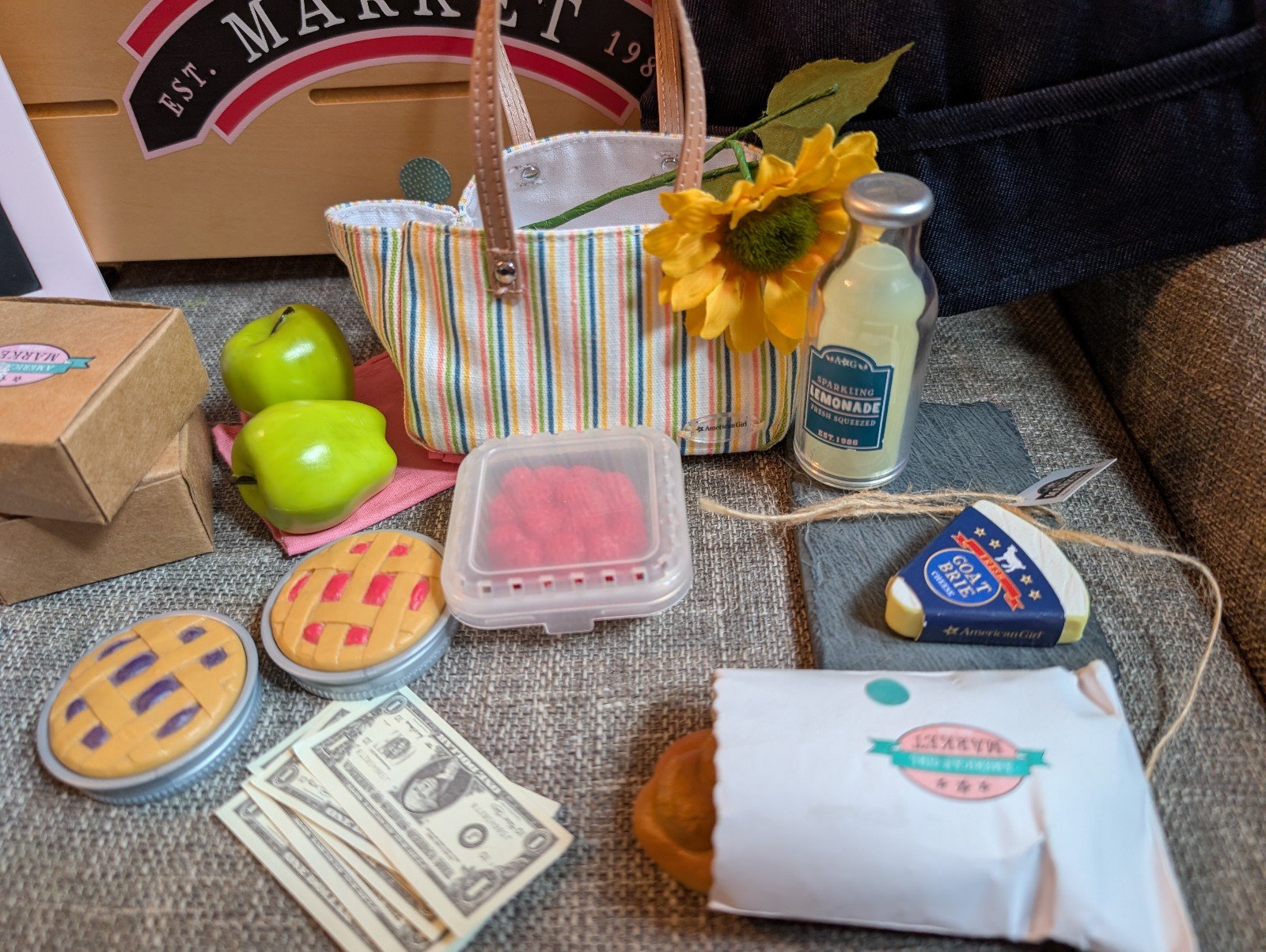 American Girl City Market and City Market Goodies. In very good, gently played with condition. Boxes have some damage from tape, dings. Missing sticker sheets -stickers have been used on stand and sign. Missing one business card. One brown box has some damage. Accessory set is complete.