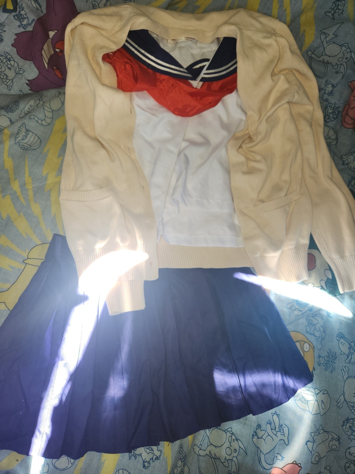 Skirt, shirt with red scarf. Sweater pouches for legs and waist